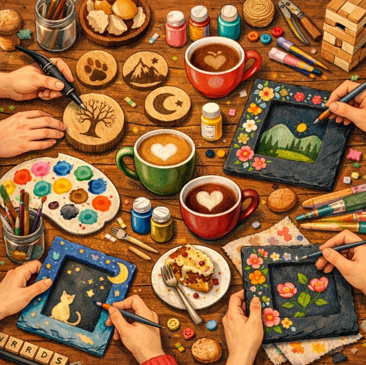 At a craft café like BenaBerry's in Castle Donington, you're not just a customer passing through. You're a participant. Whether you're wood-burning a personalised coaster, painting a slate photo frame, or getting hands-on with laser engraving, you're actively engaged in something meaningful.