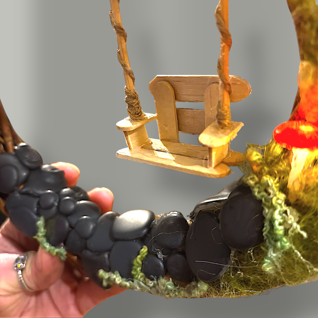 You’ll start with a sturdy 25cm (approx) grape vine wreath base and have access to a wide selection of materials including lights, foliage, mosses, twigs, other fairy details, and decorative elements — allowing you to create a wreath that’s entirely your own. We'll show you how to create the mushrooms, stones and fungi from scratch using hot melt glue and paint.